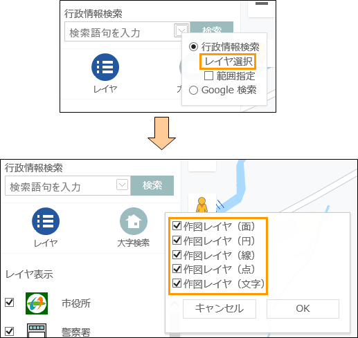 住所や施設名のキーワードを⼊⼒して検索すると、選択されているレイヤ、追加したメモから該当する情報を⼀覧で表示します。