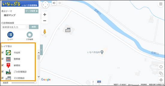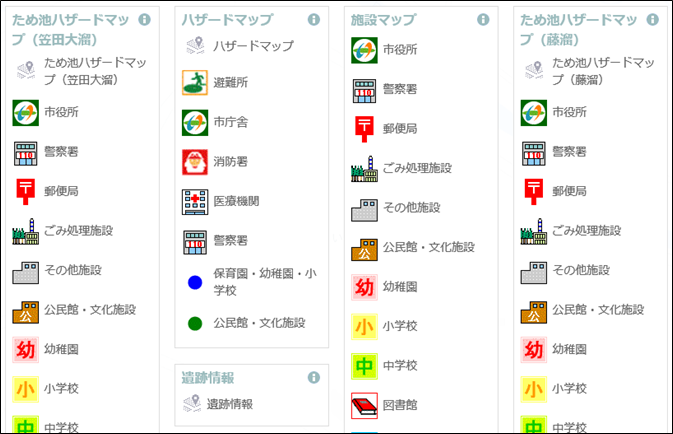 サイドパネルの「レイヤ」を押すと、現在表示されているテーマのレイヤ⼀覧が表示されます。 レイヤの名称を選択することで、表示状態を切り替えることができます。