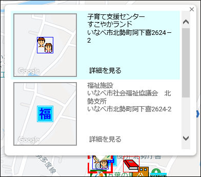 住所や施設名のキーワードを⼊⼒して検索すると、Google検索から該当する情報を⼀覧で表示します。