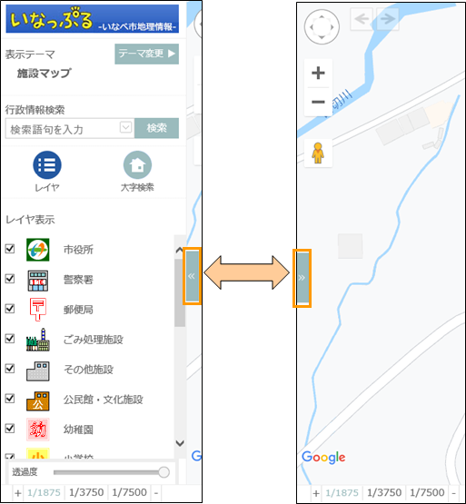 サイドパネルから、変更したい地図(左は地図「1」、右は地図「2」)を選択します。