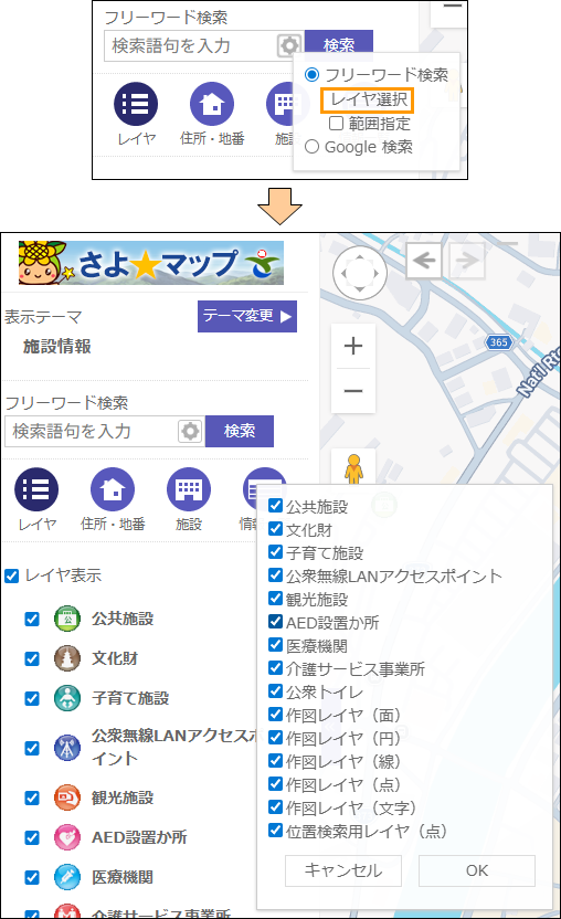 住所や施設名のキーワードを⼊⼒して検索すると、選択されているレイヤ、追加したメモから該当する情報を⼀覧で表示します。