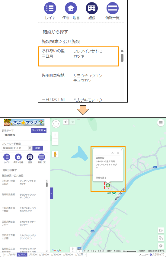 施設の⼀覧から選択し、⽬的の場所を表示します。 ⼀覧からリンクを選択すると、⽬的の施設を中⼼に地図が表示されます。