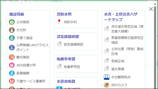 サイドパネルの「レイヤ」を押すと、現在表示されているテーマのレイヤ⼀覧が表示されます。 レイヤの名称を選択することで、表示状態を切り替えることができます。