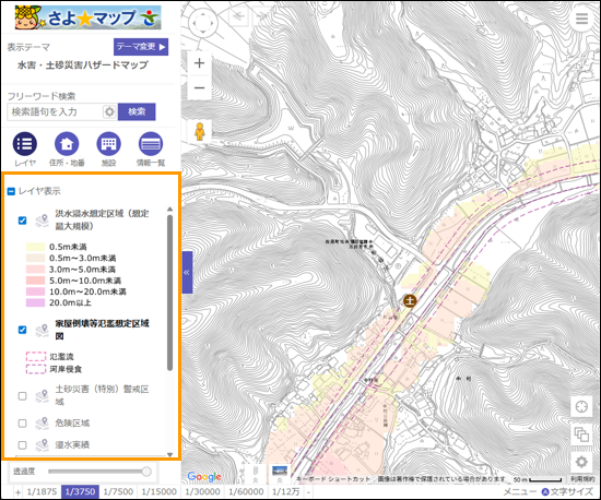 レイヤ⼀覧の下にある「透過度」のスライダーを動かすことで、レイヤ⼀覧にある地図の透過度を変更することができます。 左に移動するほど薄く、右に移動するほど濃く表示されます。