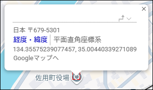 「この場所の情報」をクリックすると、その地点の住所、座標が表示されます。