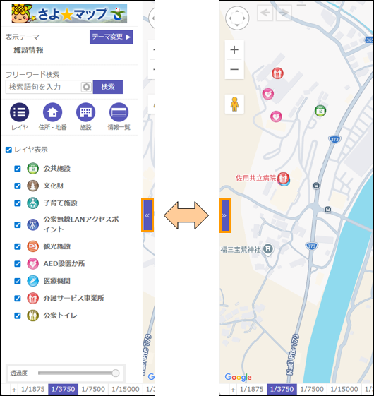 サイドパネルから、変更したい地図(左は地図「1」、右は地図「2」)を選択します。