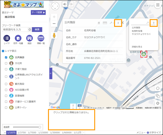 情報の⼀覧、および、詳細情報では、クリップ機能を利用することができます。