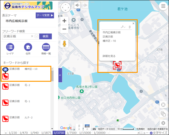 検索結果の⼀覧から⽬的の情報を選択すると、その情報の場所を中⼼に地図を表示します。