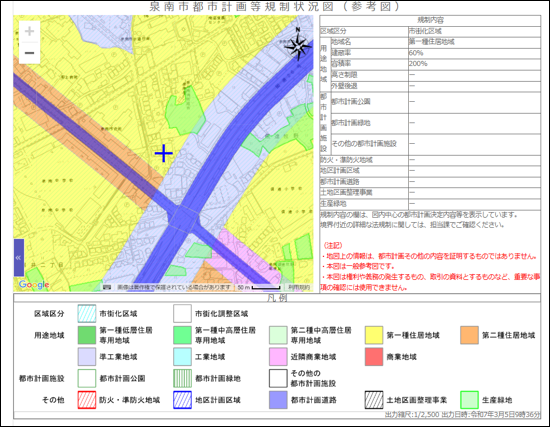 「+」が表示されている箇所の都市計画情報が下に表示され、印刷を実行すると一緒に出力されます。
