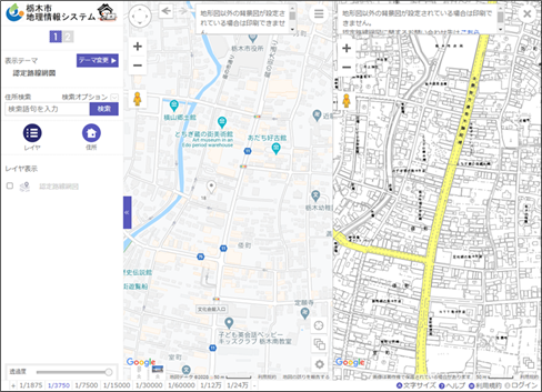 地図右下の設定ダイアログから「2画面表示」ボタンを押すと、地図を左右に並べて表示することができます。 左右の地図の座標と縮尺は連動して動きます。