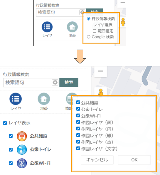 検索対象とする「レイヤ」を選択できます。
