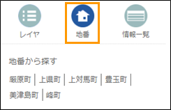 住所や施設名のキーワードを⼊⼒して検索すると、選択されているレイヤ、追加したメモから該当する情報を⼀覧で表示します。