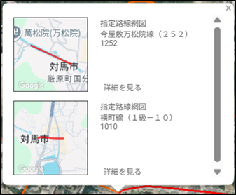 情報を表示したい図形を地図上で選択すると、その地点にある情報の⼀覧が表示されます。 ⼀覧から⽬的の情報を選択すると、図形に関する詳細な情報を確認することができます。