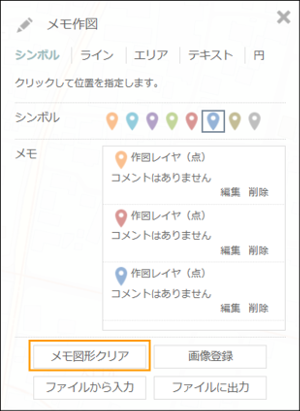 追加したメモ図形は、「メモ作図」ダイアログの「メモ」の⼀覧から、「削除」を選択することで個別に削除することができます。
