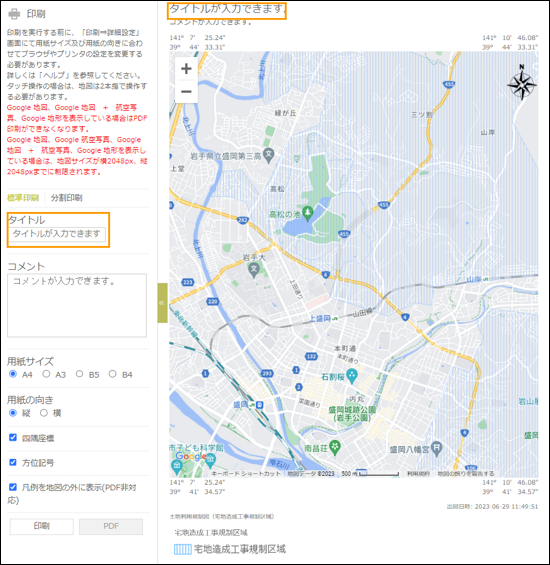 標準印刷では現在表示している地図を⼀枚の用紙に印刷することができます。