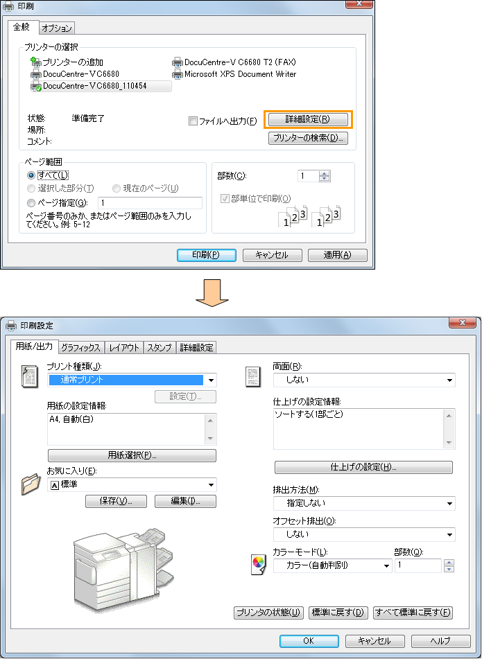 印刷ダイアログの「詳細設定」ボタンをクリックすると、詳細設定ダイアログが表示され用紙サイズや向きなどを変更できます。