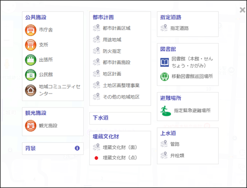 ボタンを押すことで、変更できる背景の一覧が表示されます。 一覧から背景の地図を選択すると、地図の背景を変更できます。