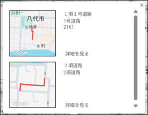 情報を表示したい図形を地図上で選択すると、その地点にある情報の⼀覧が表示されます。 ⼀覧から⽬的の情報を選択すると、図形に関する詳細な情報を確認することができます。
